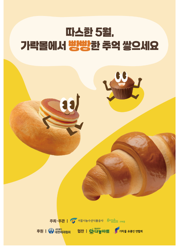 - 가락몰 빵지자랑 구매자 대상 빵쿠폰 100% 증정 : 3만원 이상 구매영수증 5천원 빵쿠폰 증정(선착순 1500명)