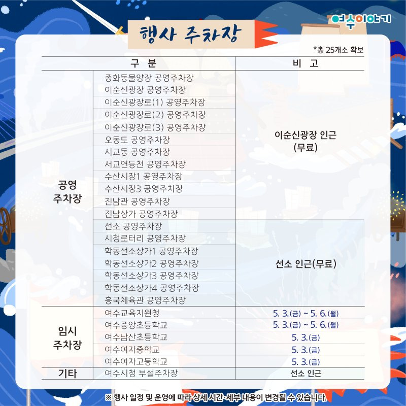 - 임시주차장: 여수시청 임시운영 예정 (셔틀버스 연계)