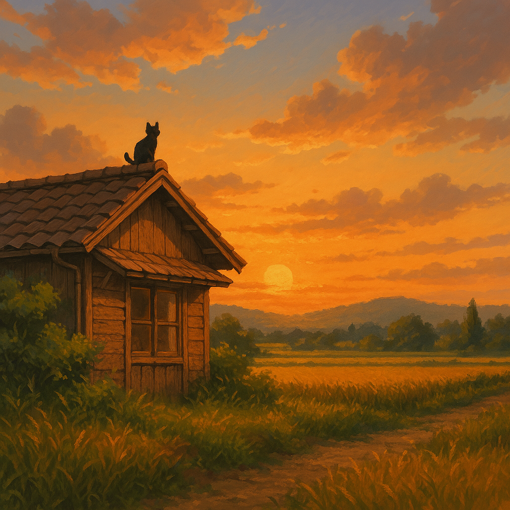 노을이 물든 들판 너머로 작은 나무집이 보인다. 지붕 위엔 고양이 한 마리가 앉아 있고, 하늘엔 구름이 느릿하게 흘러간다. 조용한 시골 풍경이 마음을 편안하게 만든다.
